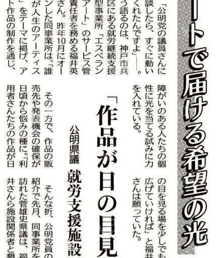 本日の公明新聞に、先日の新開地冬まつりでの、就労継続支援B型事業所「エスペランサアート」さんの記事を、掲載いただきました…