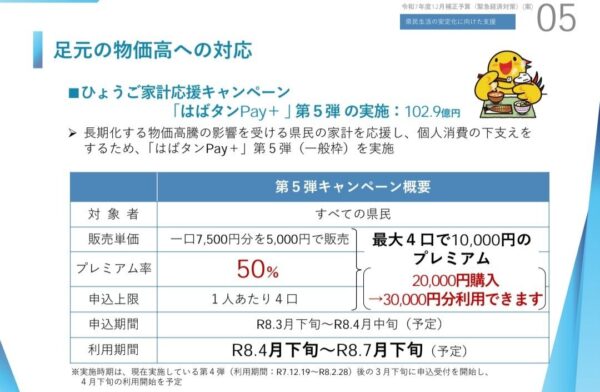プレミアム率が50%のデジタル商品券「はばタンPay+」第5弾(全ての県民を対象に販売する「一般枠」、プレミアム率は一般枠では初めて50%と設定。 1口5千円で4口まで申し込みができ、2万円で購入すれば3万円分として利用可能)や、マガキ大量死の対策などを盛り込んだ一般会計の補正予算案が決まり、引き続き長引く物価高騰対策に全力で取り組んで参ります。